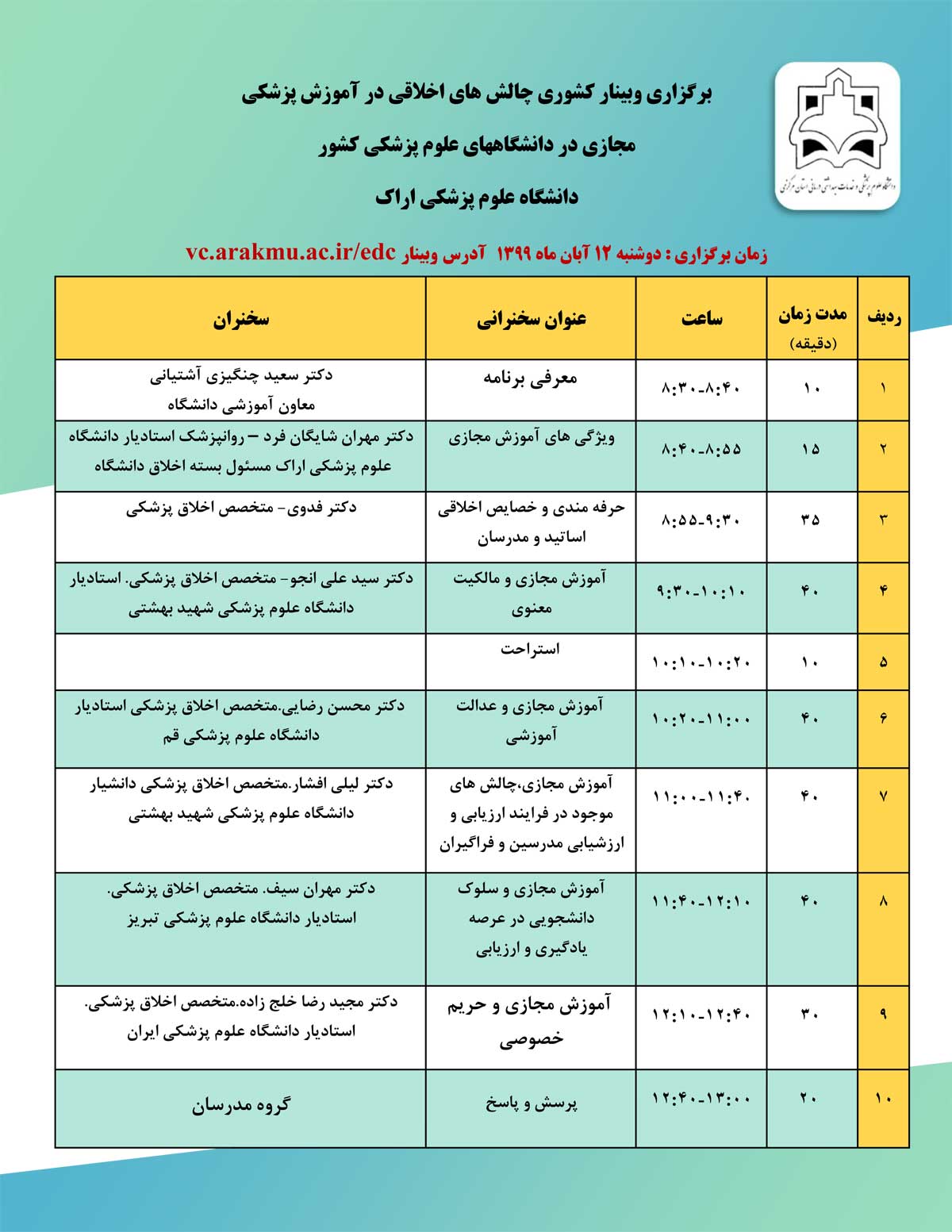 با توجه به همه گیری ویروس کرونا و در راستاي توسعه آموزش مجازي، دانشگاه علوم پزشکی استان مرکزی "وبينار كشوری چالش های اخلاقی در آموزش پزشكی مجازی" را در تاریخ 12 آبان ماه 1399 به صورت مجازی برگزار می نماید.