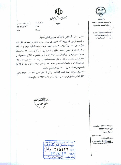 پژوهشگاه فناوریهای نوین علوم پزشکی ابن سینا در نظر دارد کارگاه های تخصصی آموزشی تئوری و عملی خود را با اساتید متبحر و باسابقه و با ارائه مدرک رسمی و معتبر برگزار نماید.
