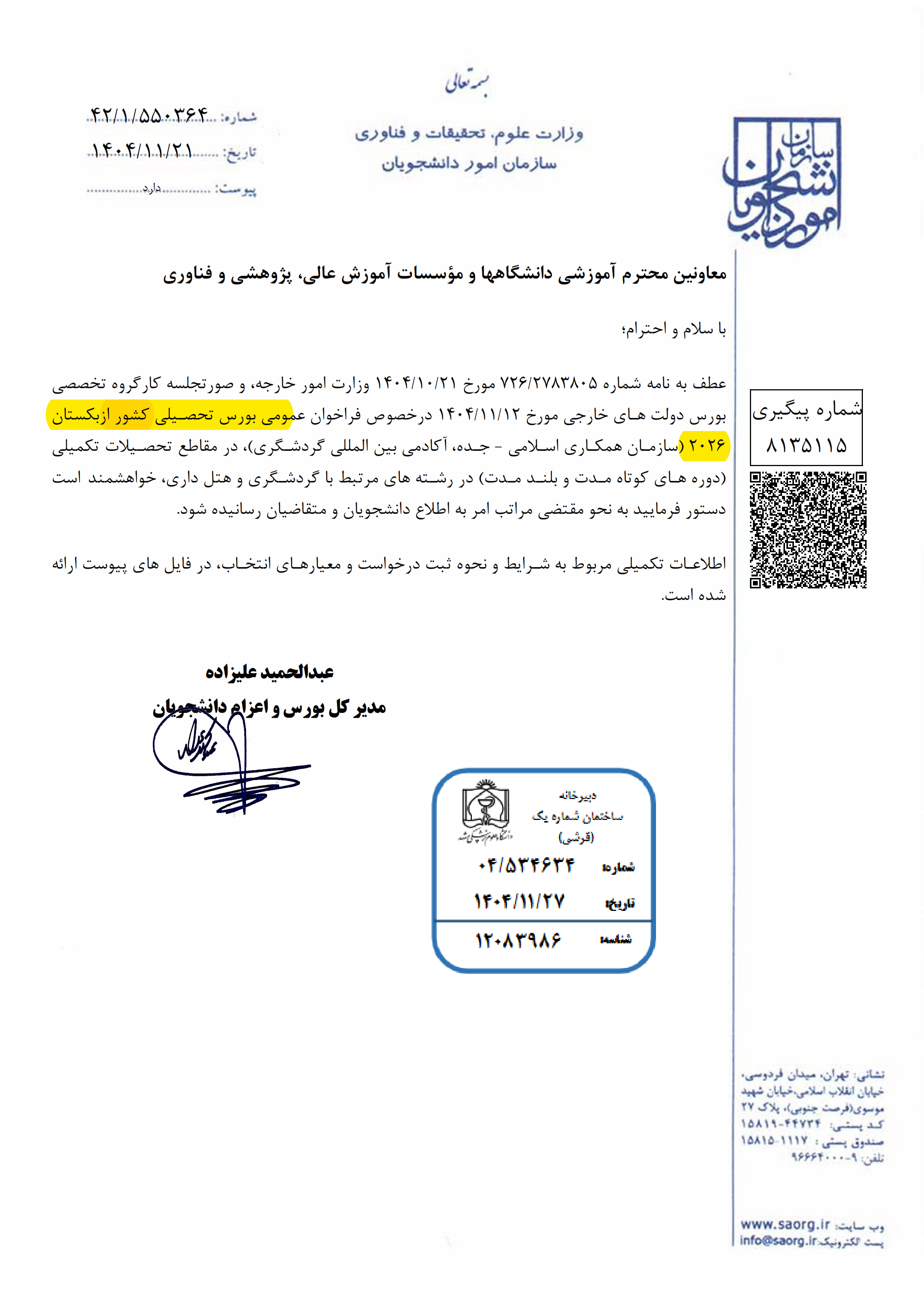 اخبار مسئول سایت اخبار EDC 29 بهمن 1404 بازدید: 13 امتیاز: ( 0 Rating ) فراخوان عمومی بورسیه تحصیلی ازبکستان امتیاز کاربران لطفا رای دهید رای 1 رای 2 رای 3 رای 4 رای 5 پیوست 1 پیوست 2 پیوست 3 قبلی بعدی