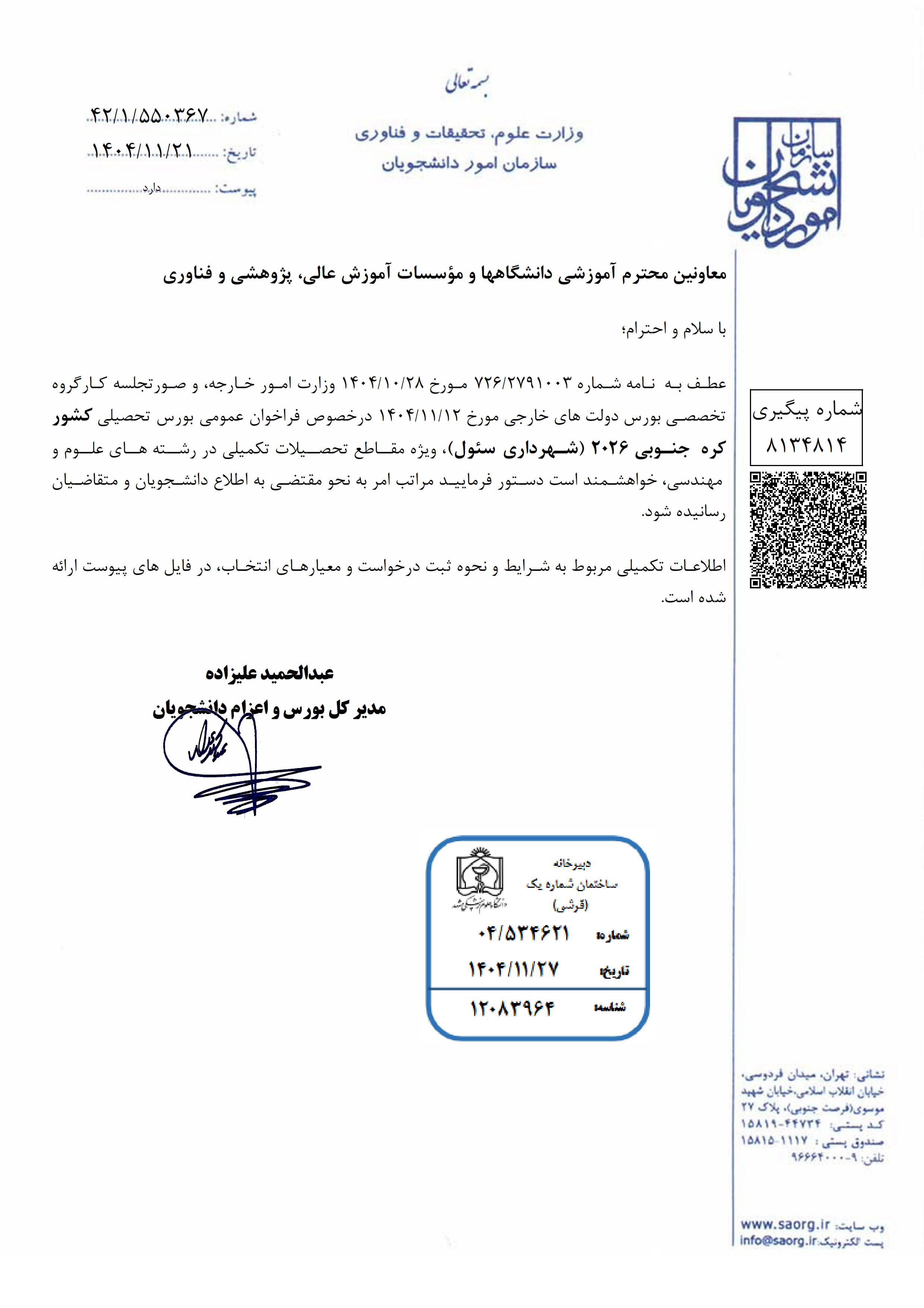 اخبار مسئول سایت اخبار EDC 29 بهمن 1404 بازدید: 17 امتیاز: ( 0 Rating ) فراخوان عمومی بورسیه تحصیلی کشور کره جنوبی 2026(شهرداری سئول) امتیاز کاربران لطفا رای دهید رای 1 رای 2 رای 3 رای 4 رای 5 پیوست 1 پیوست 2 پیوست 3 پیوست 4 پیوست 5 پیوست 6 بعدی